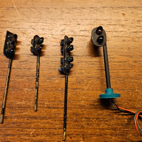 Div. H0 lyssignaler af ukendt fabrikat sælges samlet. Bemærk at det er lysdioder, så modstand på ca. 1k ohm skal monteres inden tilslutning til fx Märklin styring. På de 3 stk. til højre virker det røde lys ikke (diode skal skiftes). Sender gerne. Se også mine andre annoncer med modeltog