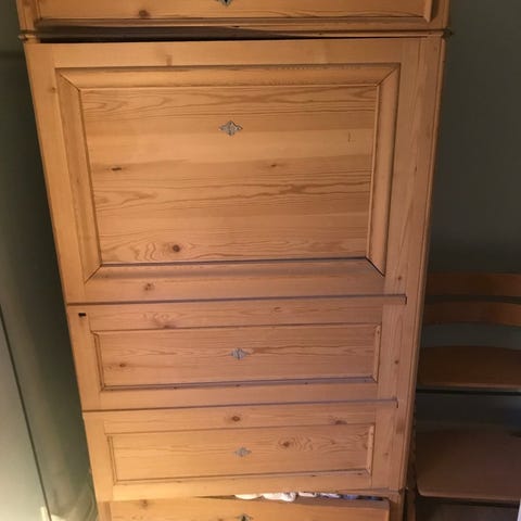 Fint karlekammerskab med 4 hylder og en skuffe forneden.