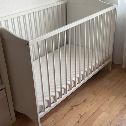 Tremmeseng malet i hvid sælges med madras, vådliggerlagen og lagen. Klassisk tremmeseng hvor bunden kan hæves