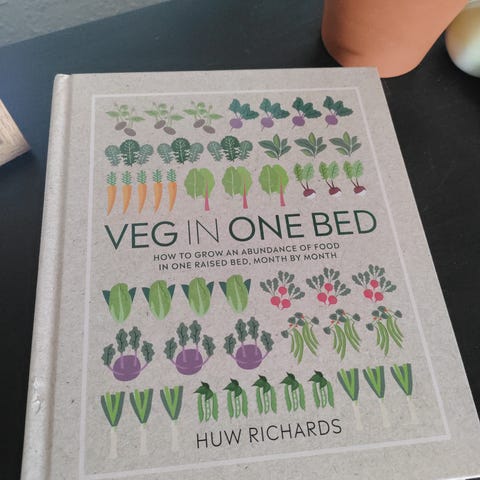 Huw Richards “Veg in One Bed” bog om dyrkning af grøntsager i ét højbed. Bogen gennemgår, hvordan man planlægger, sår, planter og høster forskellige grøntsager i et enkelt, hævet bed gennem hele sæsonen. Indeholder trin-for-trin-vejledninger, illustrationer af afgrøder og forslag til sædskifte og pladsudnyttelse i køkkenhaven eller den lille have.