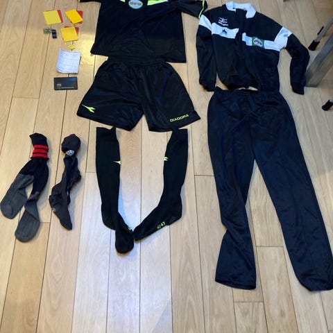 Dommertøj fra Hummel til fodbold eller håndbold. Det meste er stort set ubrugt eller kun brugt en gang. Der er 2 opvarmningstrøjer med korte ærmer, en langærmet opvarmningstrøje, en regnjakke til opvarmning, samt en tætsiddende svedtrøje. Desuden ubrugte sorte strømper. Bemærk kun sort m lange ærmer.
