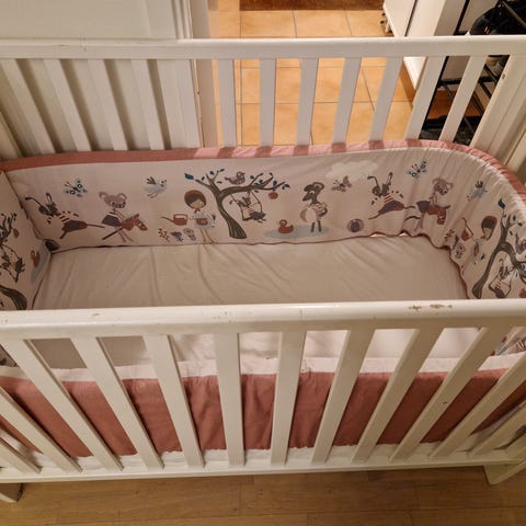 Fin, klassisk Dream tremmeseng fra JLY med en justerbar bund. Den har hjul under benene hvilket gør det nemt at flytte den rundt.