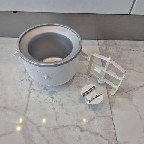 KitchenAid ismaskine skål i hvid plast/metal. Skålen fungerer som fryseskål til fremstilling af is, sorbet eller frosne desserter sammen med en KitchenAid røremaskine. Medfølgende røreindsats til omrøring under indfrysning. Skålen placeres i fryseren før brug og monteres derefter på røremaskinen efter producentens anvisninger. Velegnet som ekstra eller erstatningsskål til kompatible KitchenAid standmiksere.