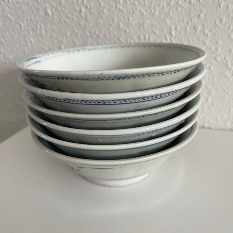 Syv skåle, hvidt porcelæn, heraf tre større (15,5 x 6,5 cm, 15 x 6 cm og 13 x 5,5 cm), to ramekiner (8,5 x 4 cm) og to mindre (6,5 x 4 cm). I fin stand, dog et minimalt afslag (kun et knappenålshoved) i kanten af den største skål og et lidt mere flageagtigt i kanten af den ene ramekin. Tåler ovn, micro og fryser. Kræver ikke meget plads, da de let kan stables. Fast pris. Afhentning i Aarhus C eller forsendelse for købers regning.