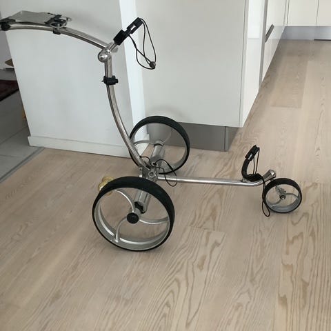 MGI Ai Navigator GPS el-golfvogn i sort. Golfvognen er elektrisk og udstyret med GPS-funktion, som vises på displayet i håndtaget. Den har store baghjul med mønster for bedre greb og et kompakt chassis. Vognen drives af et 24V litiumbatteri på 380 Wh, som er integreret i rammen. Batteri rækker til 36 huller. Købt i september 2025. Fejl fri stand og brugt få gange da jeg bruger bærebag. Tilbehør: Paraply holder og Tlf holder. Nypris kr 14.000.