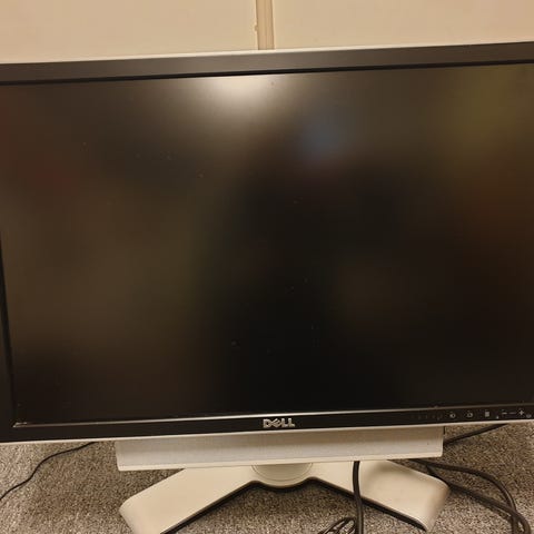 Dell skærm på 24" med soundbar. Skærmen har indbygget fod og flere tilslutningsmuligheder på bagsiden, herunder HDMI, DisplayPort, VGA og DVI samt USB-porte. Soundbar tilsluttes med mini-jack.