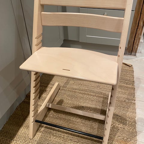 Stokke Tripp Trapp højstol i naturfarvet træ. Højstolen har justerbar siddeplade og fodplade, som kan tilpasses barnets højde. Klassisk design, der kan bruges ved spisebordet eller som siddemøbel til børn i forskellige aldre. Velegnet som børnestol i køkken eller spisestue.