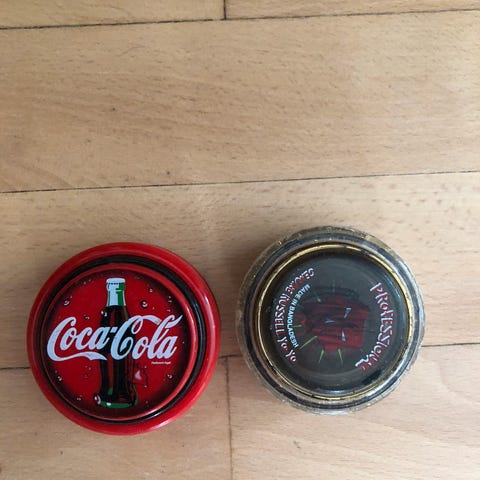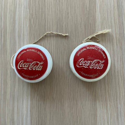 Coca-Cola Original Russell Spinner yo-yo i rød plastik. Klassisk rund model med trykt Coca-Cola-logo på begge sider og snor monteret.