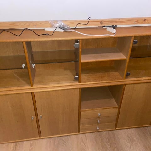 Glasskabe og væghængt skænk i bøg