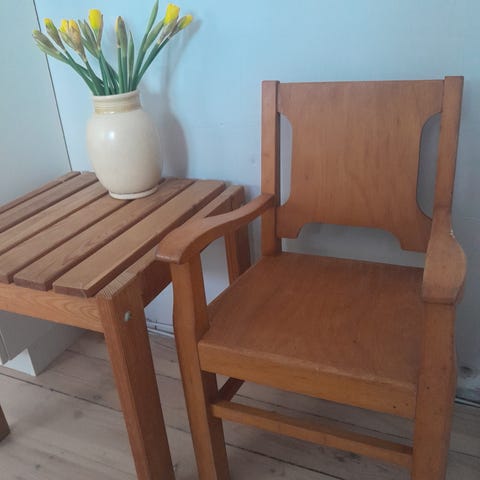 To vintage børnestole, et bord og to matchende stole til. Velegnet til mindre børn, f.eks. til leg, tegning og måltider. Farver og præcise mål fremgår af billederne.