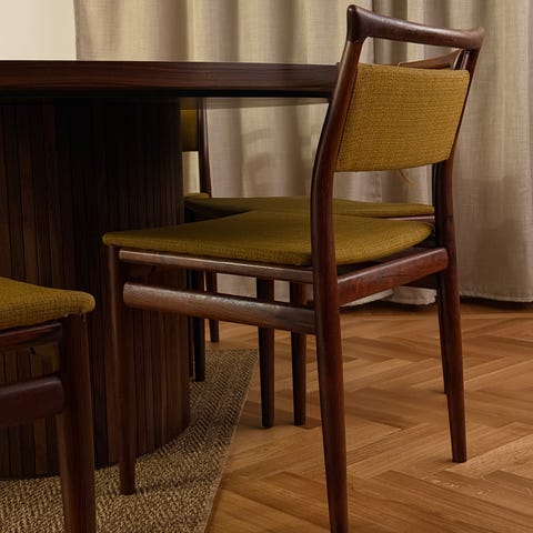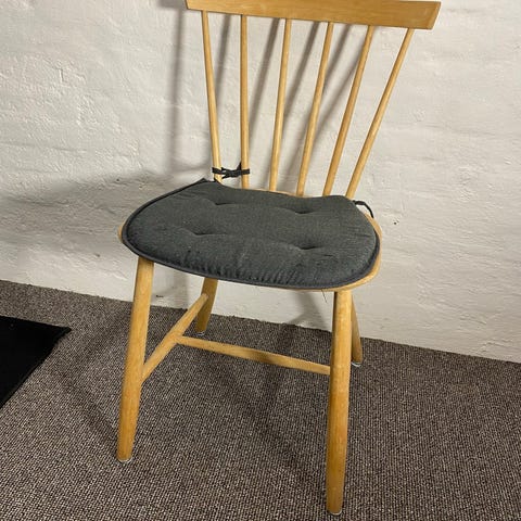 Stol nr 4 er delvist afslebet for at få det lyse træ frem. Den følger gratis med hvis interesse. Dvs. prisen er for alle 4 stole: 3 brune + en delvist afslebet.