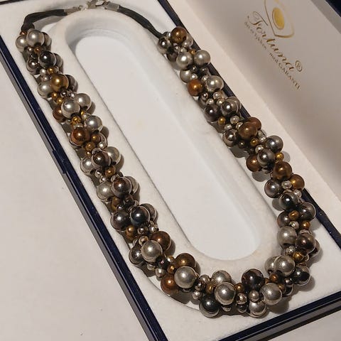 Designet er kraftigt og segmenteret forrest, hvor større perler og ringe danner et markant midterstykke, mens resten af kæden er opbygget af mindre, ensartede perler.