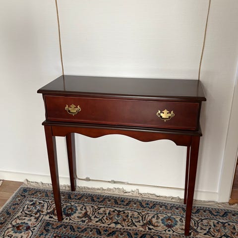 Halvmåne konsolbord i brunt træ. Bordet har tre lige ben og en halvrund bordplade, som gør det velegnet til placering op ad en væg eller i en entré. Konstruktionen er i massivt træ med synlige samlinger under bordpladen. Egnet som lille afsætningsplads til fx lamper, nøgler eller dekoration i stue, gang eller soveværelse.
