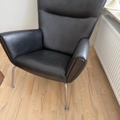 Hans J. Wegner lænestol Wing Chair (Bemærk “KOPI”) med tilhørende skammel i grøn stofpolstring. Stolen har højt ryglæn og brede armlæn, og begge dele står på slanke metalben med kuglefødder. Sættet egner sig til brug i stue eller læsehjørne som komfortabel siddeplads med ekstra benstøtte.