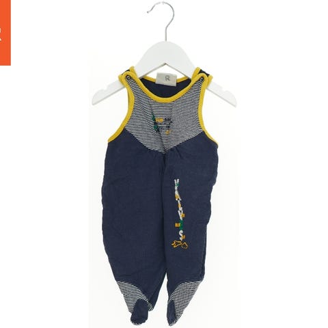 Lyseblå heldragt til baby med broderet mønster på brystet. Dragten har fødder og er uden ærmer. Den lukkes med trykknapper på skulderen.