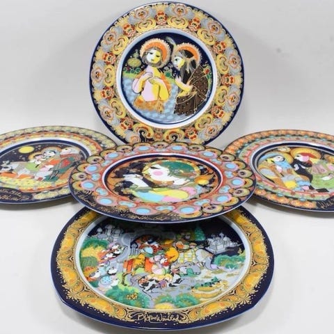 Bjørn Wiinblad - Rosenthal juleplatter i de to første og sjældne versioner fra 1971 og 1972 sælges for samlet lav pris. Er dekoreret bl.a. med guld i farverigt motiv på mørk bund. Bagsiden er mærket med Rosenthal-stempel og serienavn. Velegnet som samlerobjekt eller vægdekoration. Platterne er i fejlfri stand og er som nye. De leveres i de originale kasser. De har ligget ubrugt i kasserne i ca. 35 år.