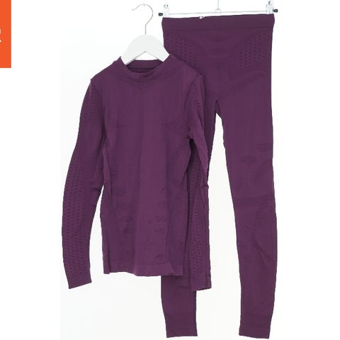Et lilla quiltet termosæt, som inkluderer en jakke og bukser. Jakken har lynlås foran og refleksbånd på ærmerne. Bukserne har elastik i taljen og refleksbånd ved benene. Der er et refleksmærke på bagsiden af jakken.