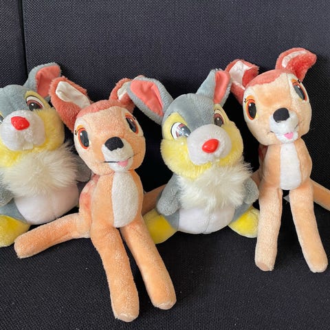 Dette er et tøjdyr af karakteren Stampe fra Disneys 'Bambi'. Tøjdyr er gråt med lysebrune detaljer og har en hvid, fluffy hale. Øjnene er broderede, og stoffet er blødt og behageligt at røre ved. Dyret er 16 cm højt.