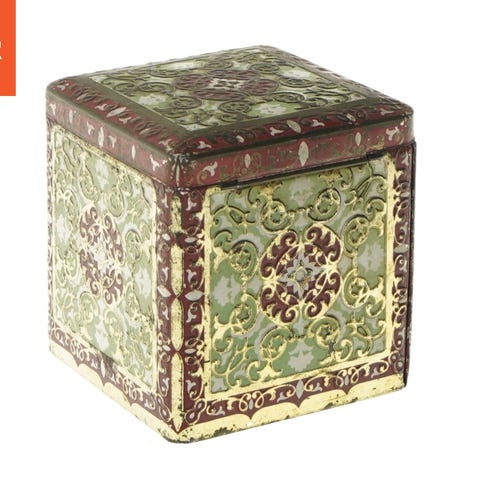 Den viste genstand er en metalæske med vintage design, måler 9x23x23 cm. Den har en rektangulær form med dekorationer på siderne, der inkluderer gule blomstermotiver og geometriske mønstre. Toppen af dåsen har et blomstret motiv på grøn baggrund med betydelige rustpletter og slid. Den bærer klare tegn på slid og rust, både indvendigt og udvendigt, hvilket giver den et rustikt udseende. Tags: æske, metal, vintage, dekoration