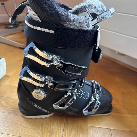 Rossignol Speed 80 skistøvler i sort og grå. Modellen har fire justerbare spænder og powerstrap øverst for bedre støtte omkring underbenet. Inderstøvlen er polstret for komfort og varme. Yderskallen er designet til alpin skiløb med god kraftoverførsel til skiene. Velegnet som alpinstøvle til pister og almindeligt skiløb.