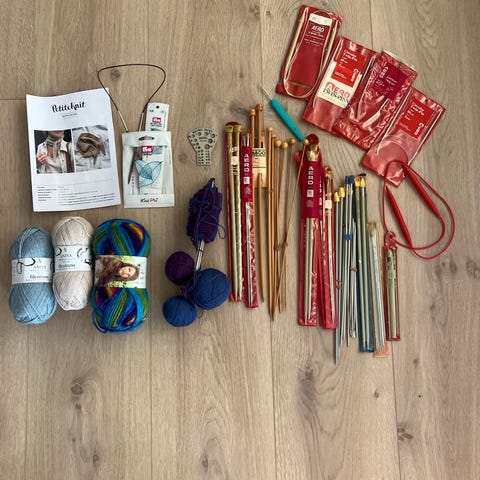 Det medfølger 2 kabelkoblere, 2 endestopper, pindemåler, 4 nøgler til fastspænding af wire og strikkepinde + 4 maskemarkører.