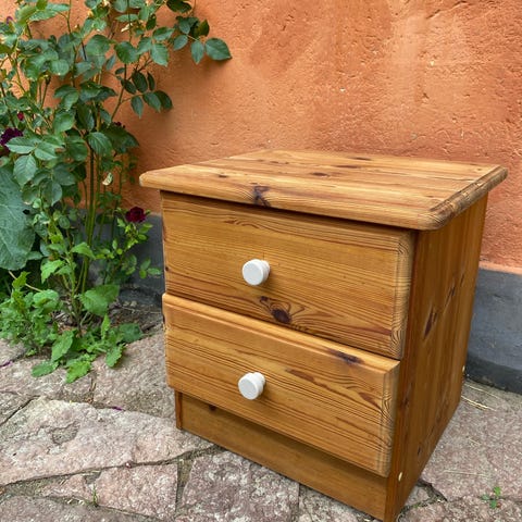 Sengebord i mørkt træ.
