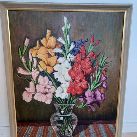 Det ene viser orange roser, det andet en farverig sommerbuket i en blå vase.