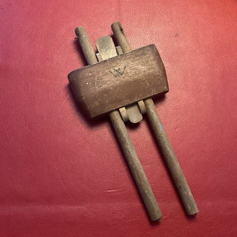 En samling af antikke stempler og relateret værktøj i en plastikkasse, indeholder forskellige stempelhoveder og håndtag, til embossing o.l. dekorative formål.