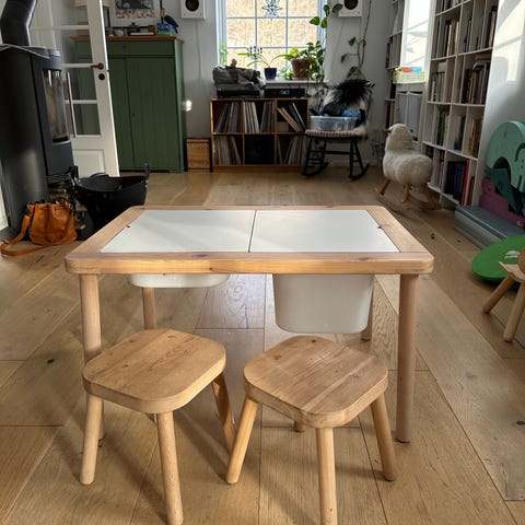 Perfekt til tegning, leg, perler og kreative projekter. Bordet har plads til kasserne, som nemt kan tages op og sættes i – så barnet selv kan rydde op.