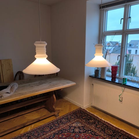 Hvide loft lamper 34 cm. Hænges i forskudt niveau - pæne og uden fejl , incl Philips energi pærer med 3 lys niveau.