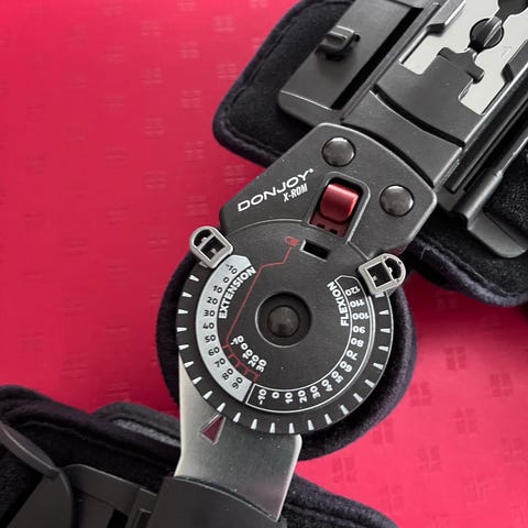 Denne genstand er en DonJoy knæskinne, designet til at give støtte til knæet. Den er lavet af letvægtsmaterialer og har en kompleks struktur med justerbare remme for optimal pasform og støtte. Knæskinnen leveres med en netpose for nem opbevaring og transport. Modellen er Donjoy Full force med en nypris på 6000 kr. Den måler 49x15 cm.