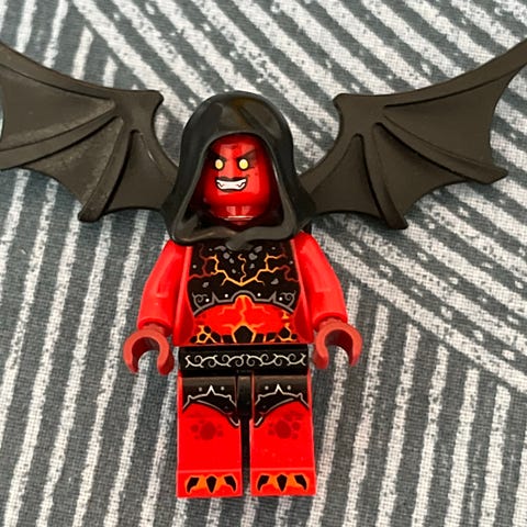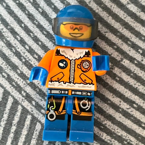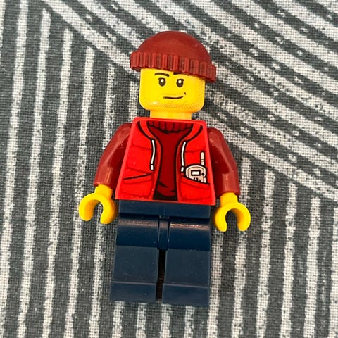 Lego minifigur af mand med grå hue, briller og beige bukser. Figuren har hvid overdel med tryk og brun rygsæk på ryggen.