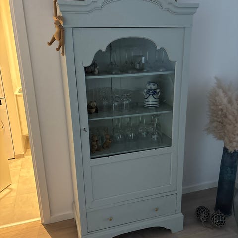 Fin hængevitrineskab i grå med flotte udskæringer.