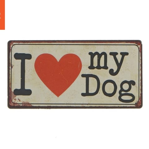 Et rektangulært vægskilt med dimensionerne 30,5x13 cm. Skiltet er lavet af metal og har en vintage stildesign med teksten: 'A home without a dog is just a house'. Der er en billedgrafik af en hund, og skiltet har en kæde til ophængning på væggen. Bagsiden af skiltet viser, at det er robust og beregnet til nem ophængning med en kæde. Det er et ideelt dekorativt element til hjemmet for hundeelskere.