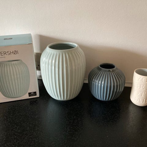 Kähler love song vasesæt i grå. Sættet består af tre cylindriske vaser i forskellige højder. Vaserne har ingen skår, dog få brugsspor - Derfor den lave pris.