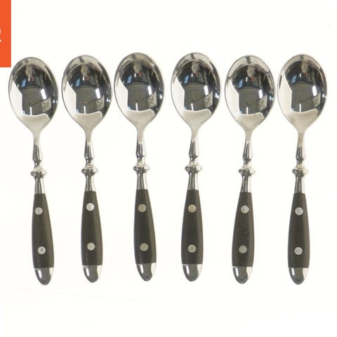Dette er et sæt bestik, der inkluderer store skeer, små skeer, og gafler, alle lavet af stål med en længde på cirka 20 cm. Der ser ud til at være et ensartet design henover alle dele i sættet. Bestikket er velegnet til forskellige typer måltider og indeholder nok stykker til en lille middagssammenkomst.