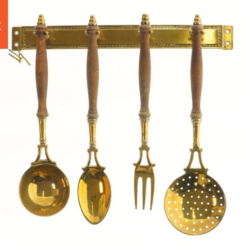 Vintage grydeunderlag / bordskåner af messing med detaljerede svungne mønstre, fire små ben og to håndtag på siderne. Kan bruges til at placere varme gryder eller pander på for at beskytte bordoverflader - eller hænges på væggen som dekorativt indretningselement.