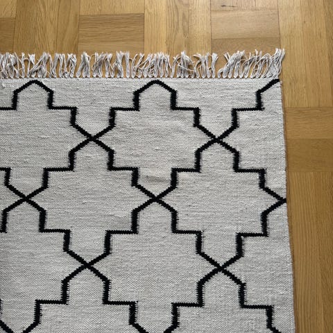 Fint tæppe med sort/hvid geometrisk mønster, måler 190 x 133. Tæppet har ingen plette eller brugsspor, har ligget i røgfrit hjem og hjem uden kæledyr.