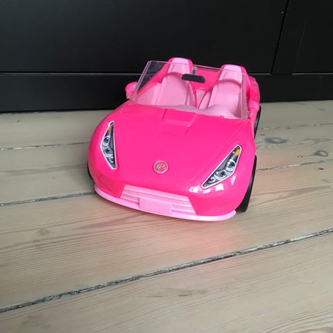 Barbie cabriolet legetøjsbil i pink plast. Bilen er åben med to sæder og detaljerede for- og baglygter. Egnet som tilbehør til Barbie-dukker og lignende dukker i tilsvarende størrelse. Velegnet til leg indendørs på gulv eller bord.