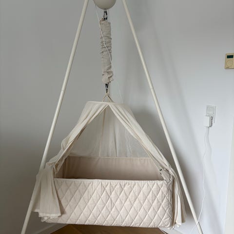 Moonboon inkl. stativ, oval vugge med fast bund, motor og himmel sælges. Der er et lille hul i på posen til fjederen (se billede). Ny stofpose kan dog købes ved Moonboon for 25kr.