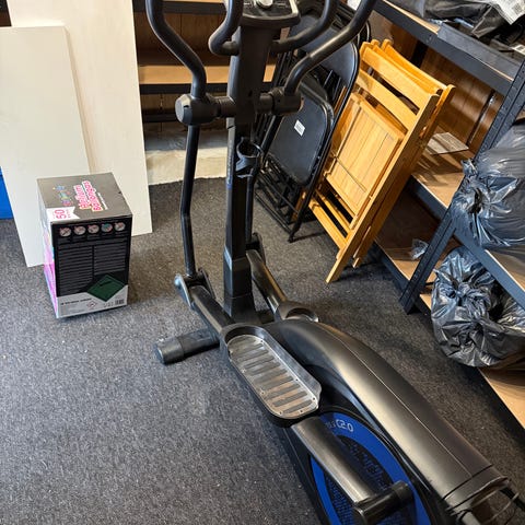Peak Fitness crosstrainer med indbygget træningscomputer. Maskinen har display, der viser blandt andet tid, distance og hastighed samt forskellige forudindstillede træningsprogrammer. Modellen har håndtag med pulssensorer og justerbar modstand, så belastningen kan tilpasses. Egnet til konditions- og helkropstræning i hjemmet.