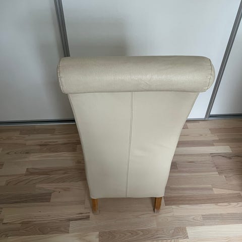 Spisestuestol i hvidolieret Eg med grå læderpolstring på sæde og ryg. Stolen har polstrede flader med knapdetaljer i ryglænet og en enkel, lige træramme. Egnet til brug ved spisebord eller som ekstra siddeplads i stue eller køkkenalrum.