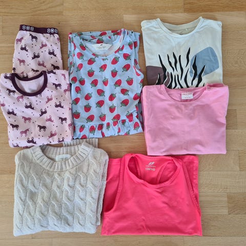 Størrelsen er ikke angivet, men vil mene, den passer str 104 og rosa cardigan