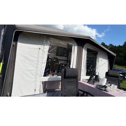 Fortelt til campingvogn i blå og grå farve. Forteltet har store vinduespartier og myggenet i fronten, som giver lysindfald og mulighed for udluftning. Egnede anvendelser omfatter ekstra opholdsrum ved campingvognen, læ for vind og vejr samt opbevaringsplads under campingferien.