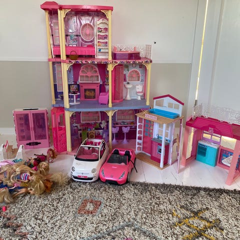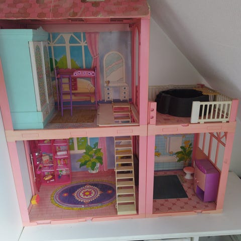 Barbie dukkehus med flere etager i plastik i lyserøde og hvide nuancer. Sættet omfatter et Barbie dukkehus med indrettede rum, møbeldelene der kan ses på billederne, en lyserød Barbie bil, to heste samt en kasse med forskelligt Barbie tilbehør som små figurer, tasker og andre smådele. Der medfølger desuden en pose med ekstra dele og møbler. Velegnet til leg med Barbie dukker og tilbehør i hjemmemiljø, hvor barnet kan indrette huset, køre i bil og lege med hestene.