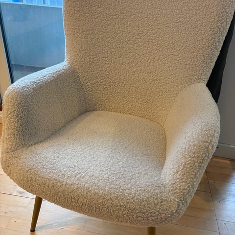Lænestol HUNDESTED råhvid teddy/natur egefarve. Meget lidt brugt og næsten ny. Sælges pga flytning. Ny pris 1000 kr. Jeg sælger 500 kr for stol og 250 kr for puf.