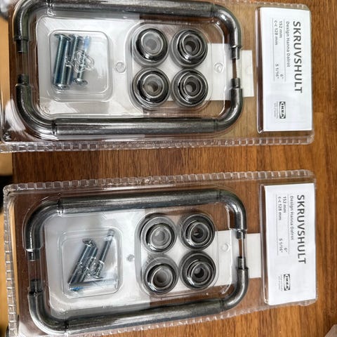 IKEA lågehåndtag i metal med tilhørende skruer. Håndtagene leveres i original emballage og er beregnet til montering på skabe eller skuffer. Velegnet til køkken-, badeværelses- eller opbevaringsmøbler, hvor der ønskes ensartede greb i metal.