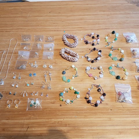 Smykkesæt med halskæde og øreringe i grå ferskvandsperler og farvede sten
