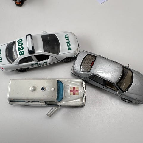 Sæt med flere små legetøjsbiler i vintage stil. Modellerne forestiller blandt andet lastbiler, tankbil, kranbil og brandbil. Alle køretøjer er i rød farve med gule/orange hjul og enkelte hvide detaljer i kabinen. Nogle af bilerne har ekstra dele som stige eller figurer på ladet. Egnet som legetøj eller som samlerobjekter til udstilling.