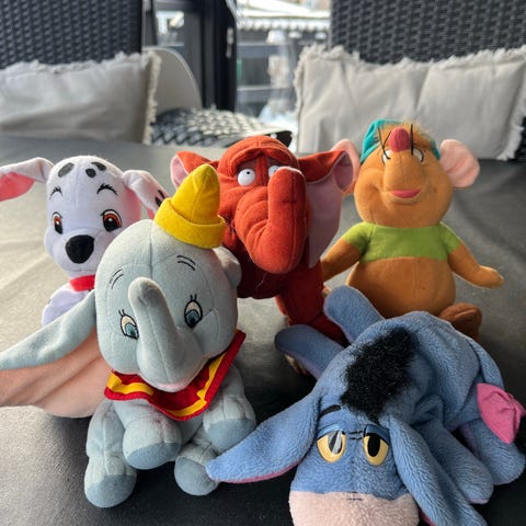 Disney plysdyr sæt med figurer fra Mickey Mouse-universet. Sættet omfatter flere kendte figurer som Mickey Mouse, Minnie Mouse, Anders And og Fedtmule i forskellige størrelser. Alle figurer er bløde plysdyr med farverigt tøj og detaljeret udformning. Egnet som legetøj til børn eller som samleobjekter og dekoration på børneværelset. Materiale er blødt tekstil med fyld, og figurerne kan typisk tørres af med en fugtig klud ved behov.